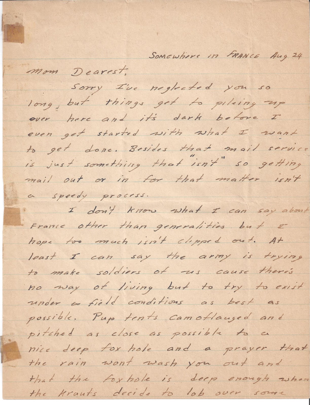 I don't know what I can say about France other than generalities but I hope too much isn't clipped out. At least I can say the army is trying to make soldiers of us cause there's no way of living but to try to exist under field conditions as best as possible. Pup tents camouflaged and pitched as close as possible to a nice deep foxhole and a prayer that the rain won't wash you out and that the foxhole is deep enough when the krauts decide to lob over some fire works is generally the order of the day. Chow is very good if dehydrated foods, canned cheese and meats, crackers and candy sit well. The only thing I really rebel at is not being able to keep clean. Sponge baths and scraping help but clothes don't dry even if there's a place to wash them. The French have been wonderful to us, helping in any way they can-with eggs, vegetables in the eating line, and cider and cognac (when there is any) just as much as they can.